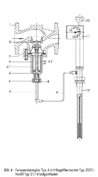 Die Regler arbeiten nach dem Prinzip der Flüssigkeitsausdehnung. Temperaturfühler (12), Verbindungsrohr (9) und Arbeitskörper (7) sind mit einer Flüssigkeit gefüllt. Ausdehnung und Entspannung dieser Flüssigkeit verstellen in Abhängigkeit von der Temperatur am Fühler den Stellbalg im Arbeitskörper (7) und infolgedessen die Kegelstange (5) des Ventils mit dem Kegel (3). Die Stellung des Kegels bestimmt den Durchfluss des Wärmeträgers über die zwischen Kegel (3) und Sitz (2) freigegebene Fläche. Der Temperatur-Sollwert wird mit einem Schlüssel (10) auf einen an der Sollwertskala (11) ablesbaren Wert eingestellt.